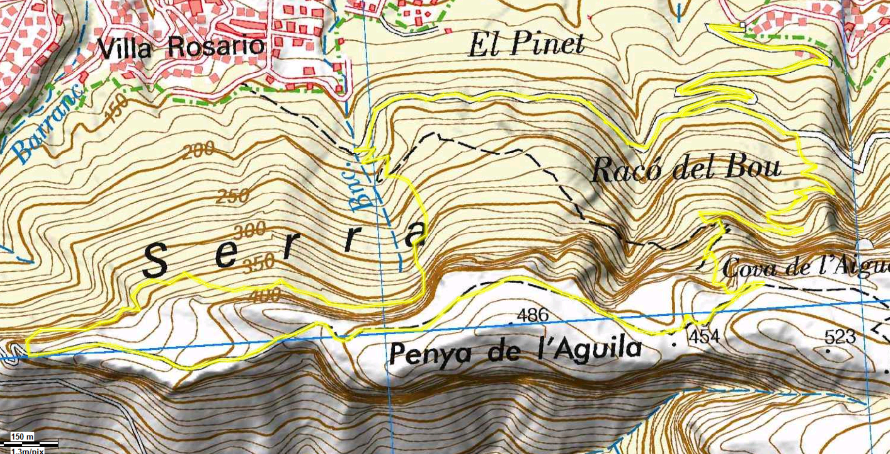 Mapa con la ruta desde la cadena de inicio del Pare Pere, pasando por le pico del aguila, y el raco del bou-
